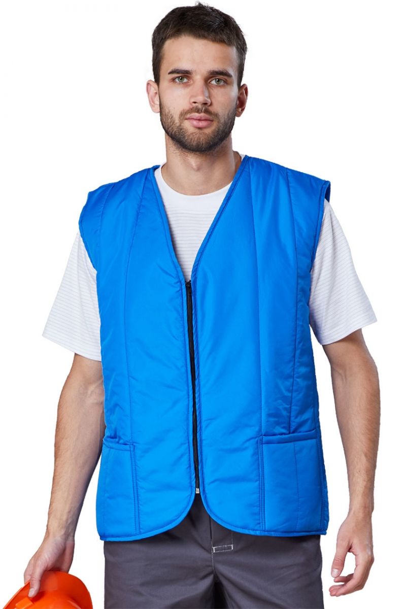 Жилет прямого силуэта, с центральной бортовой застёжкой на тесьму «молнию». Два нижних прорезных кармана с горизонтальным входом. С внутренним накладным карманом.