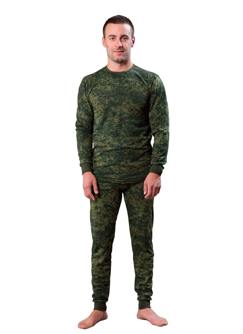Куртка камуфляжной расцветки с длинным рукавом с кальсонами. Трикотажные манжеты на рукавах и на брюках. Анатомический шов, плоские швы.